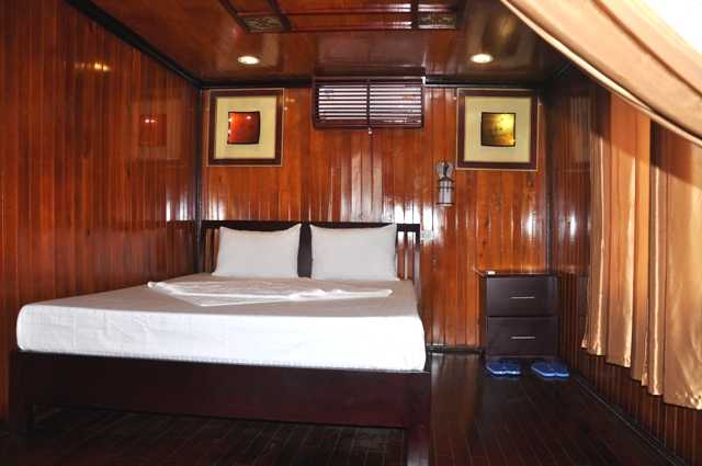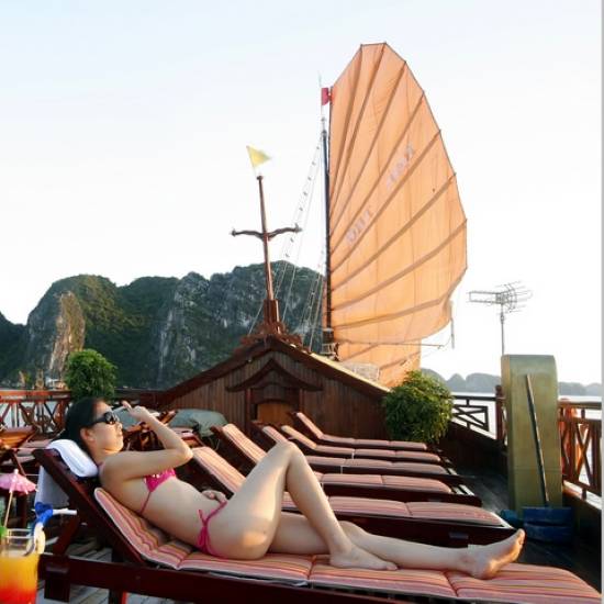 Bai Tho Junk is a traditional junk, small enough to be intimate but large enough to be comfortable, is the perfect way to explore the bay. The Bai Tho boat has 4 cabins, 5 cabins, 6 cabin, 7 and 8 cabins, 10 junk cabin and especially 18 cabins, all -conditioned, en-suite cabins and a glorious picture-window salon with sofas and easy chairs, this vessel elegantly explores the islands and bays. The Vietnamese food on board is exceptional, served by friendly local staff. The standard designed and deluxe main hall on the cruise is the place where you can watch the views and listen to the whisper of the sea. There is also the top deck for those who love sunbathing. Please come to the cruise’s bar for relaxation, entertainment as well as for drinks. You can also enjoy delicious Vietnamese dishes prepared by gourmet cuisine at the dinning room.